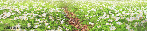Spring landscape, banner, panorama - view of the path through the meadow with anemone nemorosa in the spring forest. Horizontal background