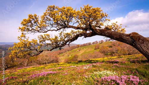 spring, landscape, tree, tree branch, blue, sky, hill, season, grass, day, sunny, tree branch, nature, big, field, plant, park, scene, wood, oak, green, summer, fall, leaf, vibrant, huge, object, bark, environment, tranquil, background, springtime, foliage, light, scenery, sun, garden, serene, organic, forest, meadow, sunlight