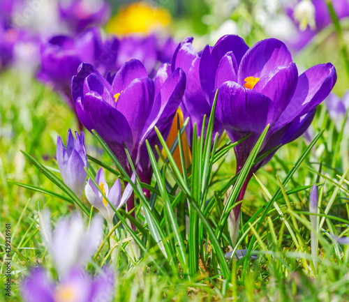 Spring meadow with various crocus flowers