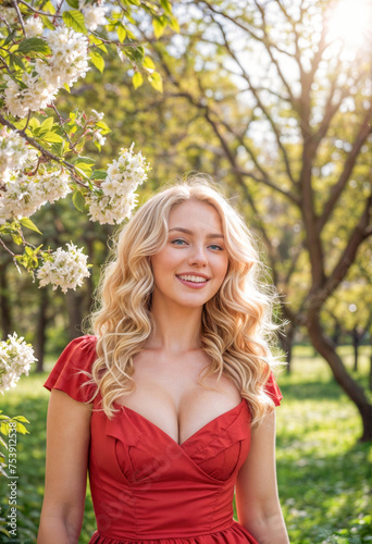 red, gown, flower, person, model, face, woman, fashion, park, spring, dress, nature, pretty, caucasian, female, hair, portrait, young, beauty, garden, summer, tree, breast, seductive, sexy, smiling, big, blond, happy, floral, girl, beautiful, blossom, season, luxury, sensual, smile, stylish, blooming, sakura, european, background, gorgeous, coiffure, picture, illustration, generated
