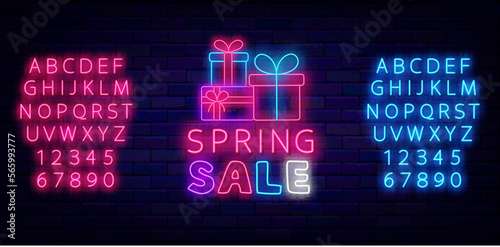 vector, neon, spring, season, sale, discount, shop, gift, present, bow, box, surprise, special, offer, retail, marketing, march, april, may, emblem, trade, banner, advertising, promotion, badge, market, holiday, store, glow, light, bright, laser, shiny, signboard, lettering, handwritten, illustration, item, signs, symbol, logotype, concept, announcement, design, template, flier, brick, font, alphabet