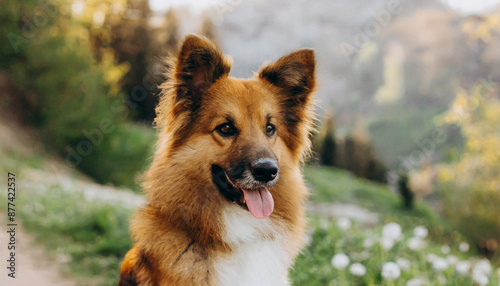 Spring, summer concept, playful happy pet dog puppy running in the grass and listening with funny ears