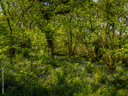 Spring woodland, Devon, UK. With bluebells, ferns and even sunshine.