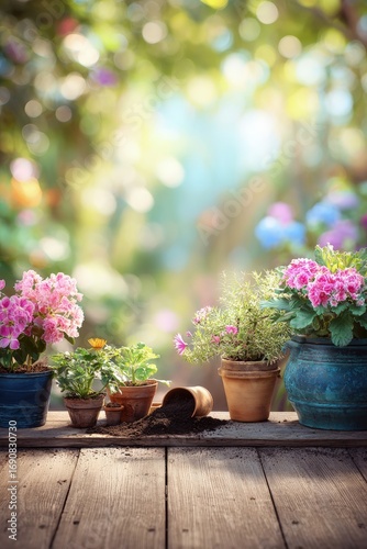 spring, garden, flower, plant, potted, pink, purple, blue, terracotta, wooden, table, nature, blooming, colourful, beautiful, bright, sunlight, morning, decor, floral, arrangement, flower petals, hydrangea, geranium, viola, potting, dirtied, gardening, growing, springtime, sunshine, vintage, rustic, peaceful, relaxing, closeup, detail