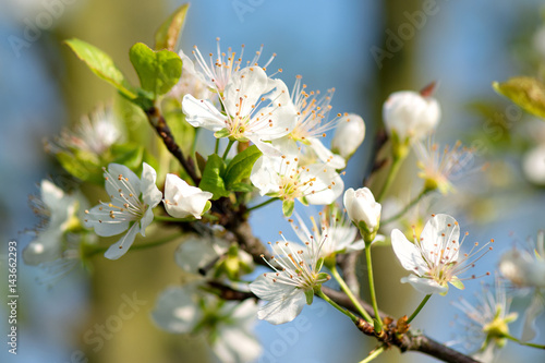 Springtime. Macro shot: Blossom of a cherry tree on a warm morning in spring.