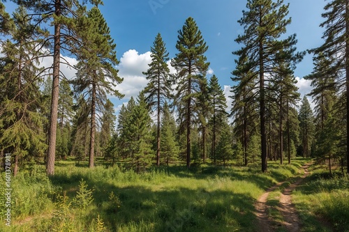Springtime pine and spruce woodland in a temperate region. Natural flora and wildlife of the area.