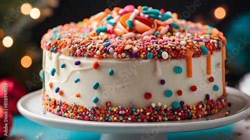Sprinkles on top of a white cake with frosting. The cake looks vibrant and festive since it has a lot of sprinkles on it.