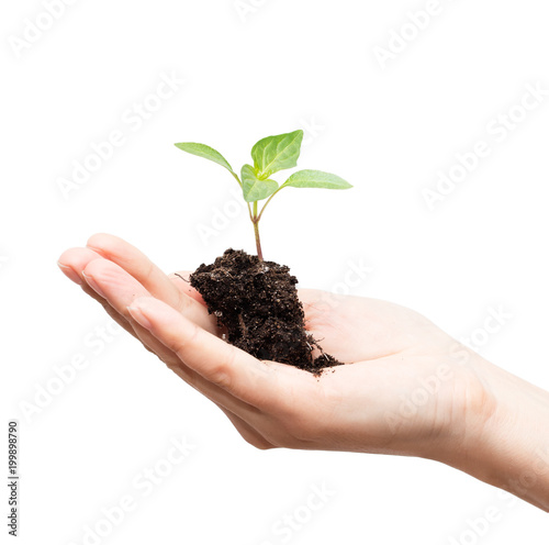 sprout of a plant in a hand on a white background