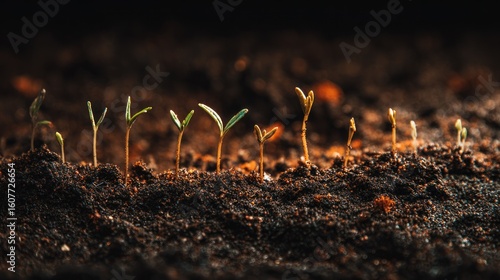 growth, dirtied, earth, plant, new, life, emerging, germinating, green, dark, ground, row, garden, agriculture, nature, cultivate, beginning, small, development, progress, organic, future, hope, potential, germinate, tiny, fresh, natural, spring, vitality, closeup, macro, sunlight, fertile, outdoors, farm, ecology, sustainable, season, growing, concept, healthy, nourishment, abundance