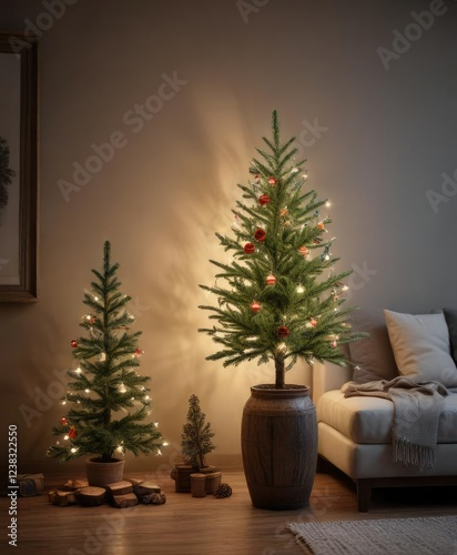 Spruce Christmas tree with fairy lights and a rustic vase on the side table, cozy cabin, spruce christmas tree, christmas decorations