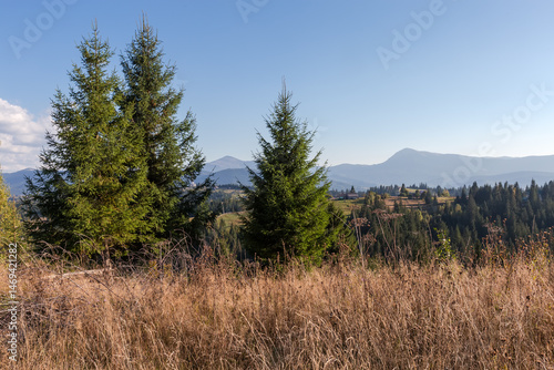tree, spruce, fir, coniferous, mountain, mountain pasture, hillside, grass, high, dry, withered, plant, nature, season, autumn, sunny, sky, clear, landform, mountain ridge, mountain chain, summit, travel, tour tourism, recreational, landscape, scenic, environment, outdoors