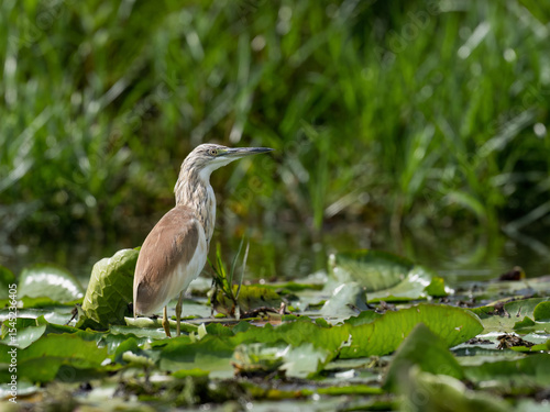 Squacco Heron foraging in Wetland Grass with Water Lilies