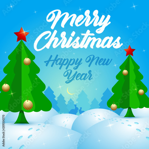square banner for the New Year and Christmas with hares in the winter forest under the moon. Greeting card, invitation to the holiday. Vector illustration
