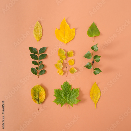 Square made of yellow and green autumn leaves on sandy pastel background. The Fall color palette. Flat lay composition.