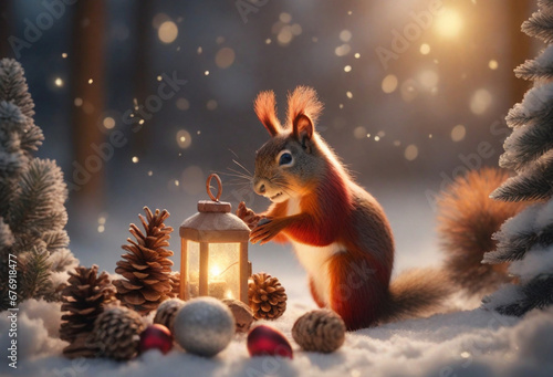 squirrel and christmas tree, winter scene in the forest, evening lights, postcard merry christmas