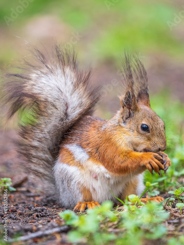 Squirrel eats a nut while sitting in green grass. Eurasian red squirrel, Sciurus vulgaris