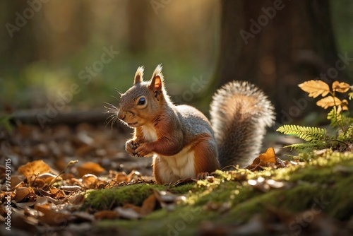 Squirrel Gathering Nuts in a Sunlit Forest: A curious squirrel scurrying along the forest floor, gathering nuts amidst fallen leaves and small mushrooms.