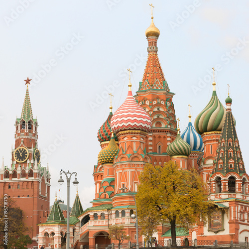St. Basil's Cathedral on Red Square and tower of Moscow Kremlin, Moscow
