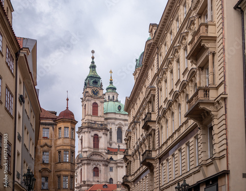 St. Nicholas Church in Prague’s Lesser Town, featuring stunning baroque architecture, green domes, and clock tower framed by surrounding historic buildings.