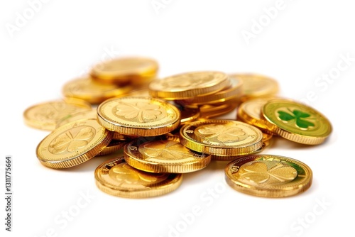St. Patrick’s Day gold coins isolated on white background, symbolizing luck, wealth, and Irish holiday celebration.