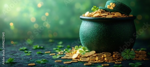 St. Patrick's Day green pot with gold coins, leprechaun hat, and shamrocks on vibrant background for festive holiday design