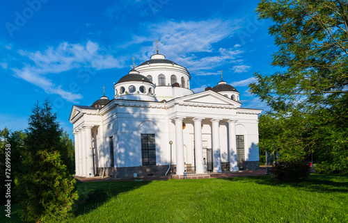 pushkin, russia, petersburg, temple, faith, byzantine, blue skies, tree, column, cross, dome, summer, cloud, worship, orthodox, religion, russian, saint, priest, cathedral, sunny day, christianity, church, architecture, building, sky, travel, europa, old, landmark, city, history, culture, white, exterior
