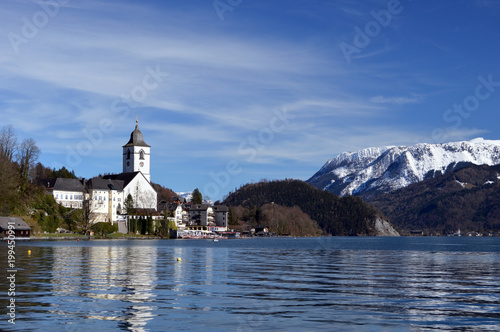 lake, austrian, alps, alpine, water, nature, natural, beautiful, romantic, europa, landscape, idylli, relax, snowy, spring, picturesque, town, church, tower, mountain, pier, chapels, austria