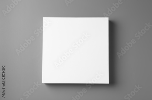 Stack of blank paper sheets for brochure on grey background, top view. Mock up