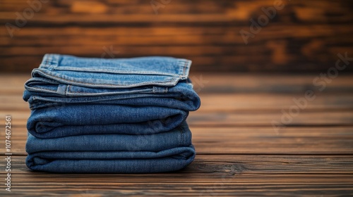 Stack of Blue Jeans on a Wooden Surface