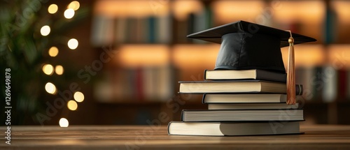 Stack of books topped with a graduation cap set against a softly blurred background, symbolizing education, achievement, and scholarly pursuits in a warm atmosphere.