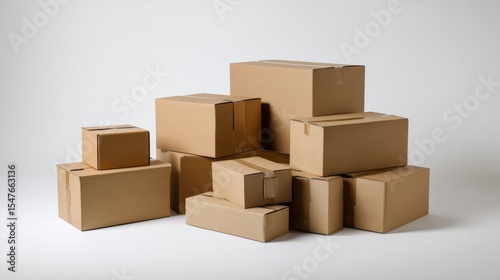 Stack of cardboard boxes arranged in shipping warehouse with light brown clean background