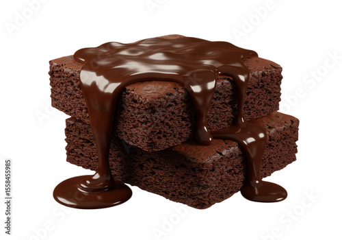 Stack of chocolate brownies with melted chocolate sauce isolated on transparent background
