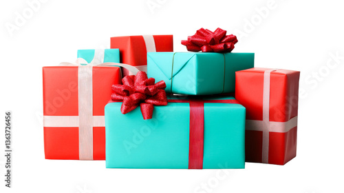 gift, present, package, box, christmas, holiday, festive, decoration, ribbon, bow, wrapped, giving, celebration, stacked, pile, colourful, red, turquoise, surprise, isolated