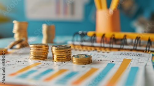 Stack of coins on financial documents, showcasing investment growth and analysis in a modern workspace.