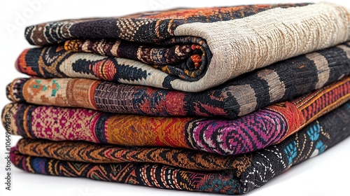 Stack of colorful, patterned textiles showcasing intricate designs and rich textures, perfect for decor and cultural inspiration.