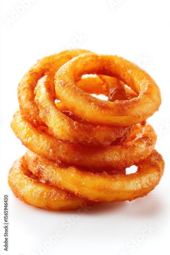 Stack of crispy golden onion rings with a crunchy texture and delicious flavor on a white background
