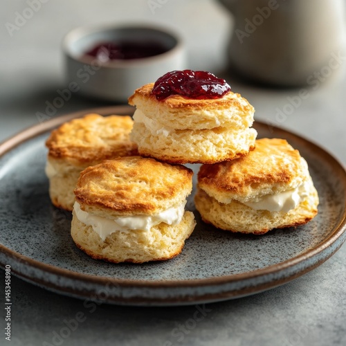 scone, cream, jam, plate, breakfast, food, pastry, dessert, snack, treat, bakery, dish, table, background, biscuit, filling, topping, sweetness, ingredient, cookery, baked, gold, crust, light, colours, texture, presentation, afternoon, tea, delicacy, freshness, epicure, homemade, indulgence, stack, serving, stoneware, pottery, surface, grey, container, still, life, culinary, kitchen, confection
