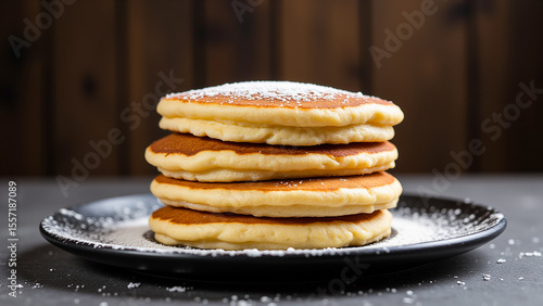 stack of fluffy pancakes on a black plate, dusted with a generous layer of powdered sugar. The background is slightly blurred, giving the focus to the delicious-looking pancakes.