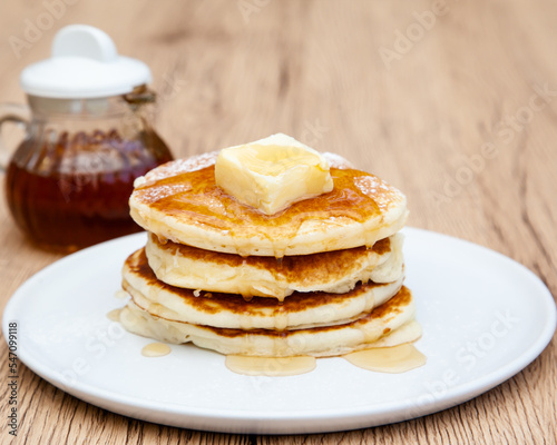 Stack of freshly made buttermilk pancakes with maple syrup and butter