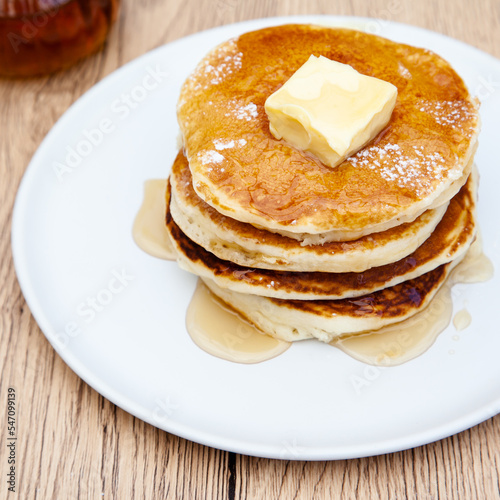 Stack of freshly made buttermilk pancakes with maple syrup and butter