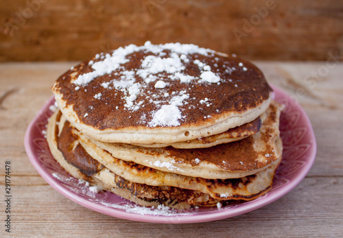 Stack of homemade clean eating oat pancakes with powered sugar on pink plate on rustic country table. Selective soft focus. Shrovetide, pancake carnival maslenitsa concept
