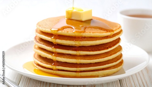 Stack of pancakes, butter, and syrup