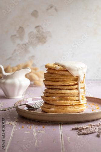 Stack of pancakes with mascarpone and orange sauce