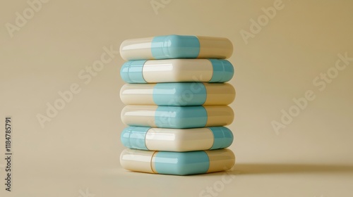 Stack of pastel-colored capsules on beige background.