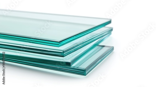 Stack of transparent glass sheets in varying thicknesses, isolated on white background, highlighting clarity, texture, and modern material design