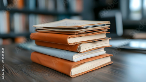 notebook, leather, journal, vintage, book, stack, desk, table, brown, tan, white, aged, worn, texture, paper, writing, reading, study, library, office, workspace, still life, closeup, detail, object, interior, home, design, retro, classic, elegant, stylish, organised, neat, bookshelf, background, wooden, surface, old book, antique, leather bound, diary