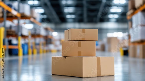 Stacked Cardboard Boxes in a Warehouse with Shelving and Storage Background