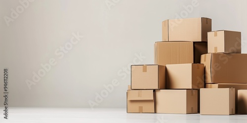 Stacked cardboard boxes on a plain background represent moving or storage organization. Neatly arranged pile of brown boxes for relocation, shipping, and packing.