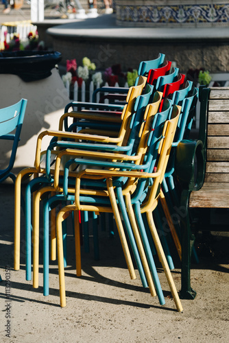 chair, chair, table, cafes, eatery, furniture, wooden, empty, wood, seat, relax, nobody, table, blue, summer, metal, outdoors, red, vacation, bar, dining, white, patio, colourful, stacked, rest, restful