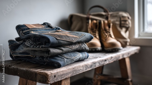 denim, jean, stack, folded, blue, brown, boot, leather, work, bench, wooden, rustic, worn, texture, detail, casual attire, style, fashion, clothing, apparel, comfort, hard-wearing, outdoors, travel, gear, bag, shoulder, handle, rugged, lifestyle, cosy, simple, everyday, practical, aesthetic, composition, still life, natural, indoor, sunlight